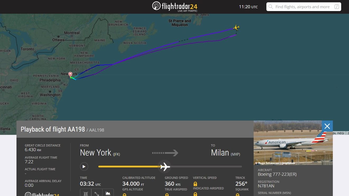 Il volo American Airlines AA198 del 7 Aprile, programmato da New York (JFK) a Milano (MXP) ha subito una modifica di programma. Infatti, dopo circa quattro ore di volo, mentre l’aereo sorvolava l’Atlantico, l’equipaggio ha deciso di rientrare all’aeroporto di partenza.