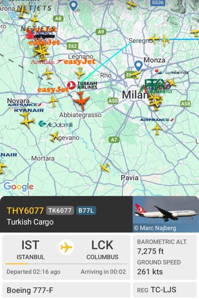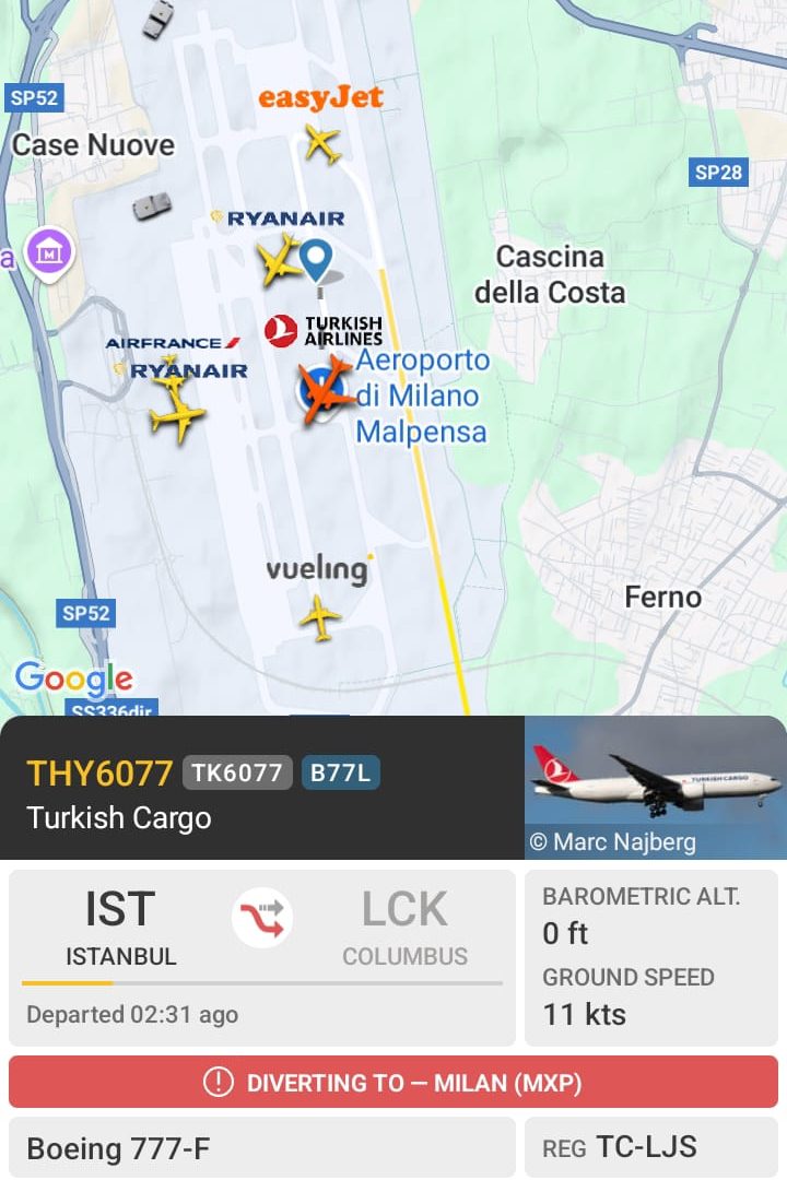 Oggi, 11 Aprile 2025, un B777F (Freighter)di Turkish Airlines, registrato TC-LJS, è atterrato a Milano Malpensa al posto della destinazione originale di Columbus (Ohio).